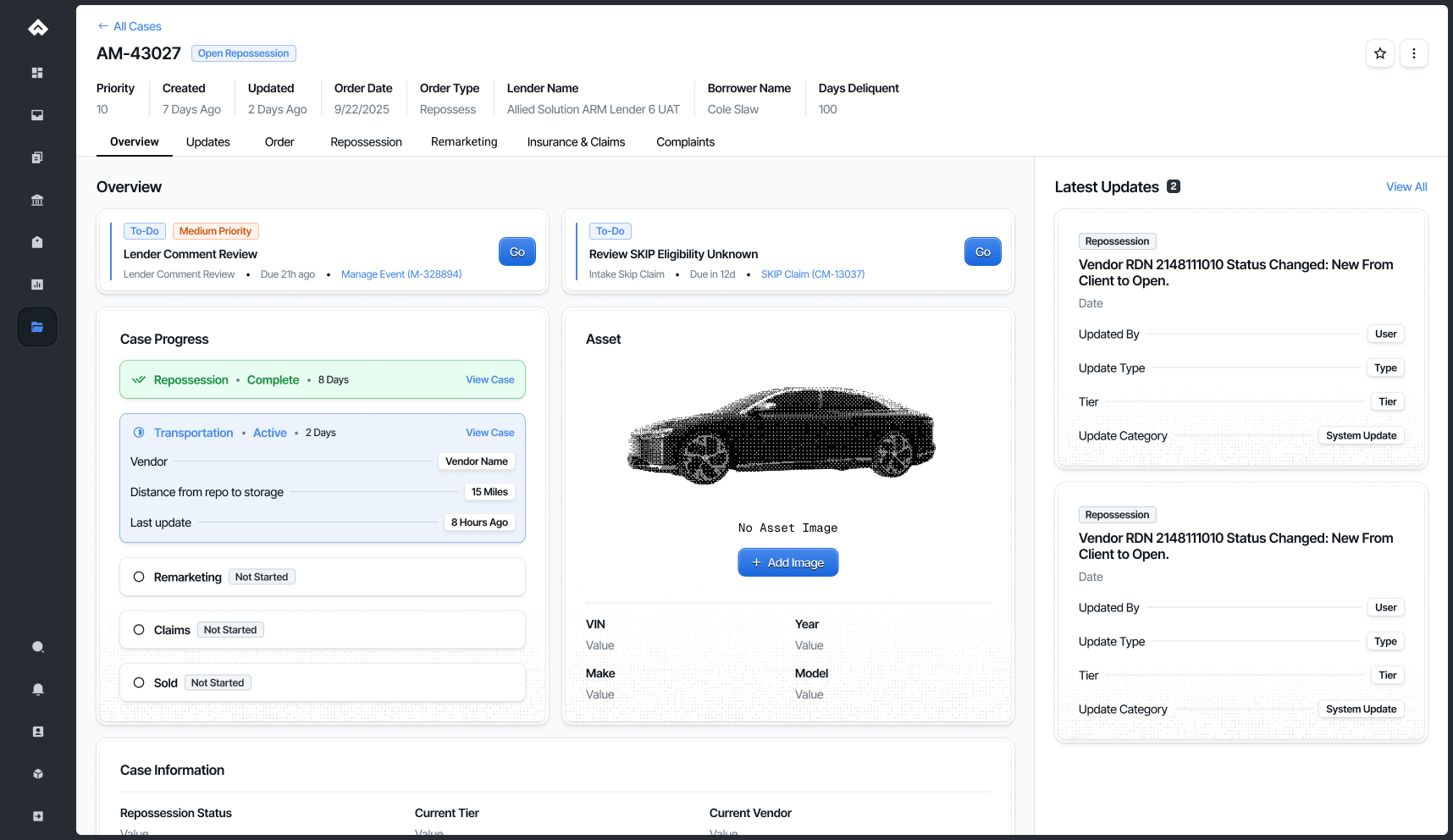 Clients managed repossession entirely through Outlook folders and subfolders. No centralized view existed for active cases, holds, or pending actions.